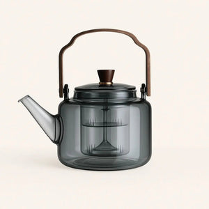 This borosilicate glass teapot combines modern simplicity with practical design. Crafted from heat-resistant borosilicate glass, it features a detachable cat’s paw–style filter for clear, residue-free tea and a sturdy ash wood handle for easy pouring. Available in smoky gray or a transparent finish, it is suitable for brewing and serving loose-leaf teas.
